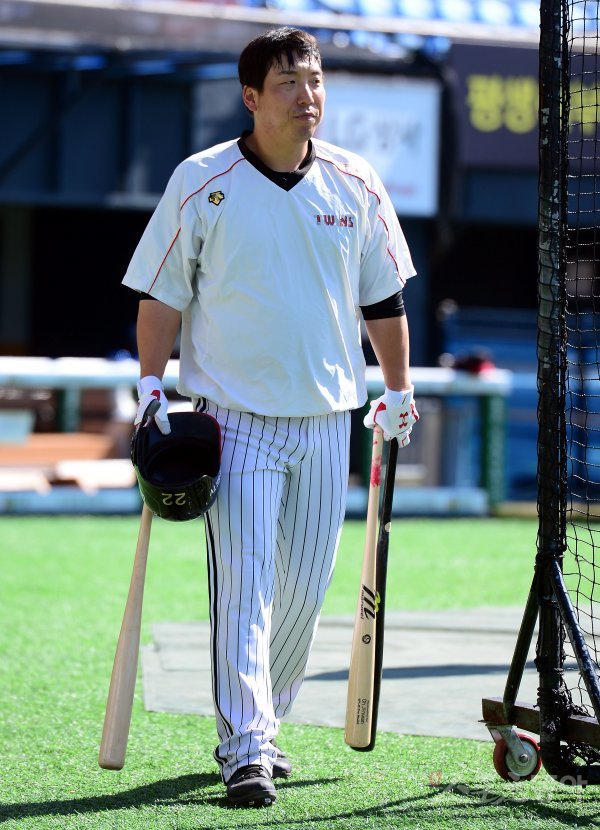 9일 서울 잠실야구장에서 ‘2019 신한은행 MY CAR KBO리그’ LG 트윈스와 키움 히어로즈의 준PO 3차전 경기가 열린다. 경기 전 LG 김현수가 훈련을 준비하고 있다.