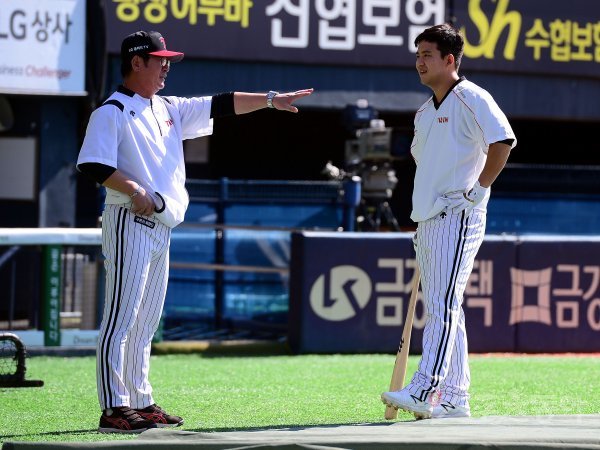 9일 서울 잠실야구장에서 ‘2019 신한은행 MY CAR KBO리그’ LG 트윈스와 키움 히어로즈의 준PO 3차전 경기가 열린다. 경기 전 LG 류중일 감독이 김민성과 이야기를 나누고 있다.
