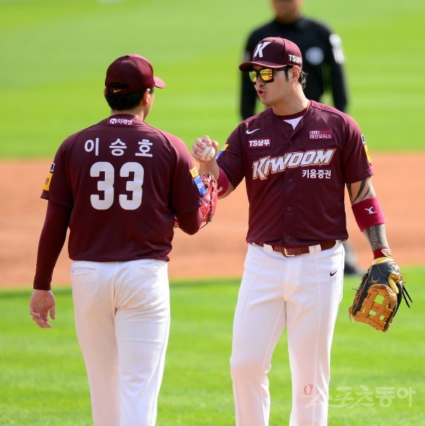 9일 서울 잠실야구장에서 ‘2019 신한은행 MY CAR KBO 포스트시즌’ 키움 히어로즈와 LG 트윈스의 준플레이오프 3차전이 열렸다. 키움 선발 이승호가 2회말 2사 1,2루 LG 정주현에게 1타점 적시타를 허용하자 박병호가 마운드로 가 이야기하고 있다.