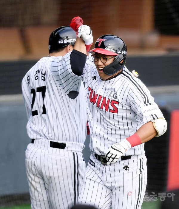 9일 서울 잠실야구장에서 ‘2019 신한은행 MY CAR KBO리그’ LG 트윈스와 키움 히어로즈의 준PO 3차전 경기가 열렸다. 4회말 2사에서 LG 채은성이 우월 솔로 홈런을 쏘아 올린 뒤 유강남과 기쁨을 나누고 있다.