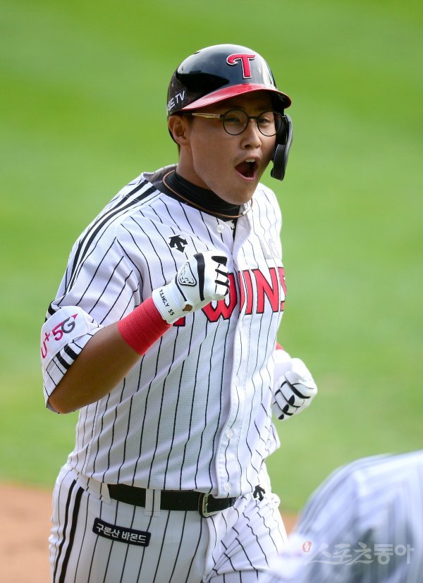 9일 서울 잠실야구장에서 ‘2019 신한은행 MY CAR KBO 포스트시즌’ 키움 히어로즈와 LG 트윈스의 준플레이오프 3차전이 열렸다. 4회말 1사 LG 채은성이 동점을 만드는 좌중월 솔로 홈런을 날리고 그라운드를 돌며 하이파이브 하고 있다. 잠실 | 김종원 기자 won@donga.com