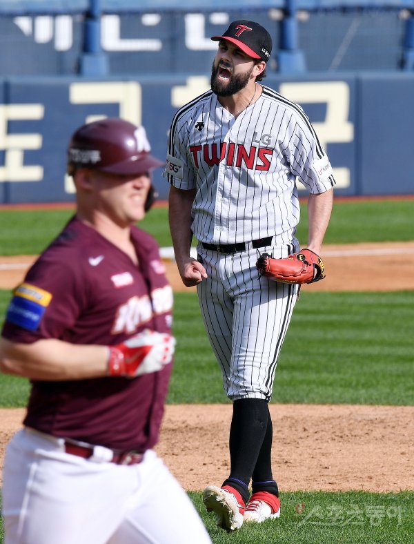 9일 서울 잠실야구장에서 ‘2019 신한은행 MY CAR KBO리그’ LG 트윈스와 키움 히어로즈의 준PO 3차전 경기가 열렸다. 5회초 2사에서 키움 샌즈를 아웃시킨 뒤 포효하고 있다. 잠실 | 김민성 기자 marineboy@donga.com