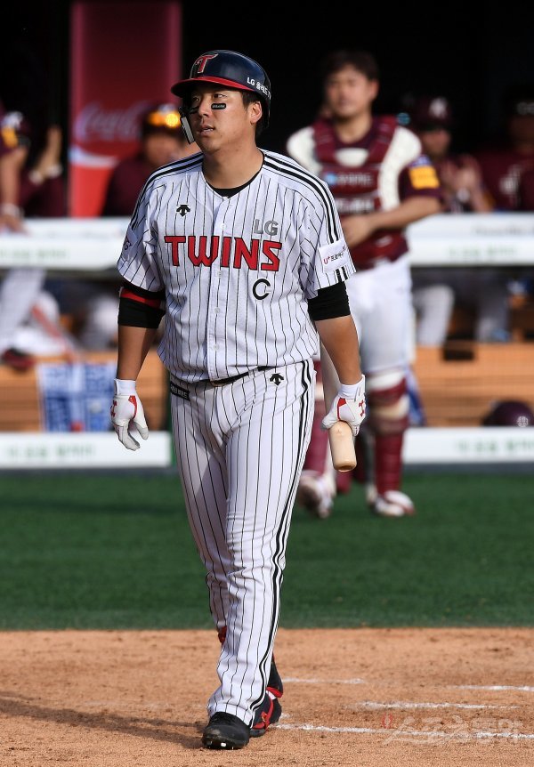 9일 서울 잠실야구장에서 ‘2019 신한은행 MY CAR KBO리그’ LG 트윈스와 키움 히어로즈의 준PO 3차전 경기가 열렸다. 6회말 무사에서 LG 김현수가 포수 파울플라이로 아웃되자 아쉬워하고 있다. 잠실 | 김민성 기자 marineboy@donga.com