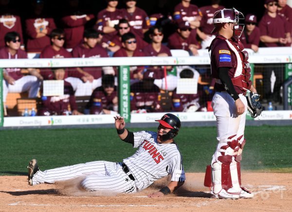 9일 서울 잠실야구장에서 ‘2019 신한은행 MY CAR KBO리그’ LG 트윈스와 키움 히어로즈의 준PO 3차전 경기가 열렸다. 7회말 무사 3루에서 LG 오지환의 1타점 희생플라이 때 3루 주자 정주현이 득점에 성공하고 있다. 잠실 | 김민성 기자 marineboy@donga.com