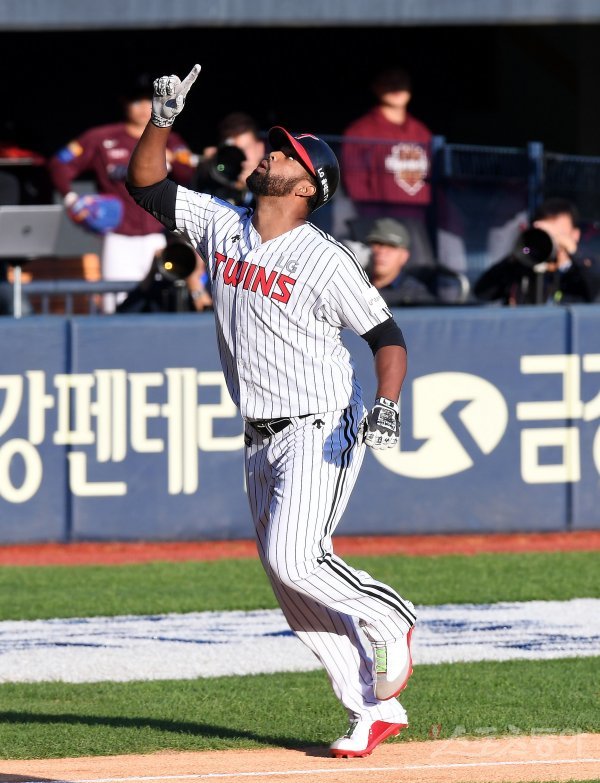 9일 서울 잠실야구장에서 ‘2019 신한은행 MY CAR KBO리그’ LG 트윈스와 키움 히어로즈의 준PO 3차전 경기가 열렸다. 8회말 무사에서 LG 페게로가 우월 솔로 홈런을 쏘아 올린 뒤 환호하고 있다. 잠실 | 김민성 기자 marineboy@donga.com