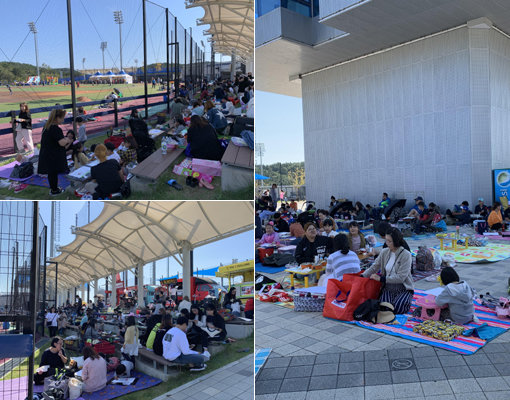 야구장을 배경 삼아 그림을 그리며 즐거운 시간을 보내고 있는 어린이들과 가족들. 사진제공|기장국제야구대축제 조직위원회