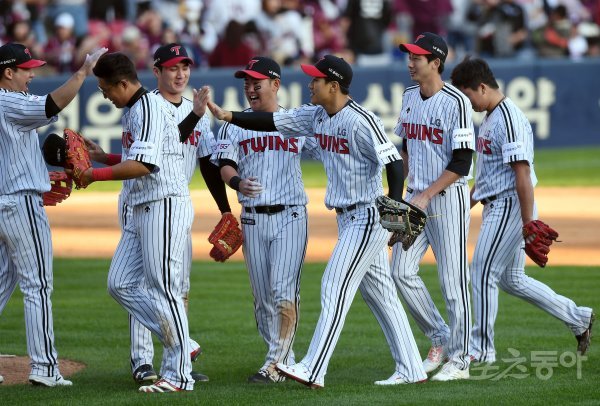 9일 서울 잠실야구장에서 ‘2019 신한은행 MY CAR KBO리그’ LG 트윈스와 키움 히어로즈의 준PO 3차전 경기가 열렸다. LG가 키움에 4-2로 승리한 뒤 선수들이 그라운드에서 기쁨을 나누고 있다. 잠실 | 김민성 기자 marineboy@donga.com