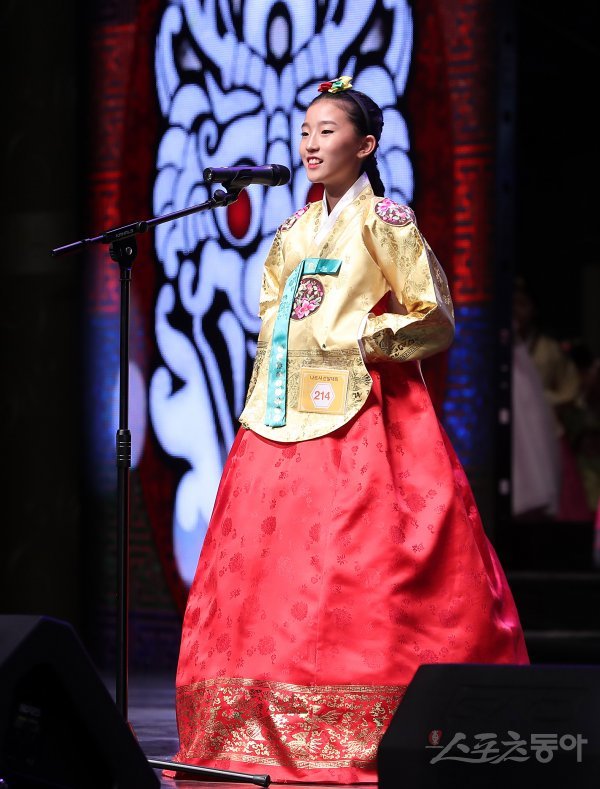 9일 서울 광진구 유니버셜아트센터에서 ‘2019 세종대왕 소헌왕후 선발대회’가 열렸다. 나르샤 부문에 참가한 이호정이 인사말을 하고 있다. 김진환 기자 kwangshin00@donga.com