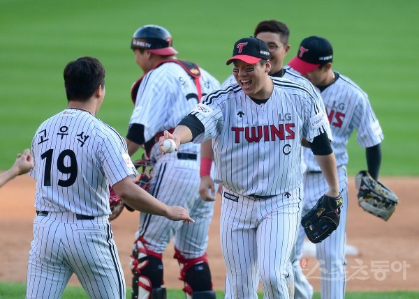 9일 서울 잠실야구장에서 ‘2019 신한은행 MY CAR KBO 포스트시즌’ 키움 히어로즈와 LG 트윈스의 준플레이오프 3차전이 열렸다. 4-2 승리를 거둔 후 LG 김현수가 고우석에게 승리 공을 전달하고 있다. 잠실 | 김종원 기자 won@donga.com