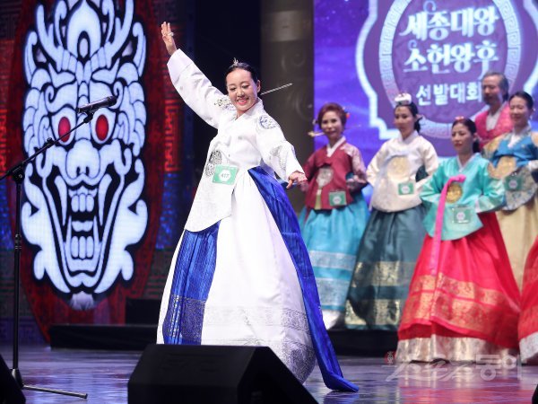 9일 서울 광진구 유니버셜아트센터에서 ‘2019 세종대왕 소헌왕후 선발대회’가 열렸다. 모도리 부문에 참가한 김소라가 흥겨운 포즈를 취하며 입장하고 있다. 김진환 기자 kwangshin00@donga.com