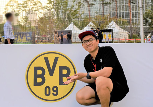 도르트문트 엠블럼 옆에서 포즈를 취한 ‘슛포러브’ 김동준 대표. 사진제공|청춘스포츠