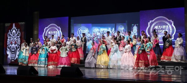9일 서울 광진구 유니버셜아트센터에서 ‘2019 세종대왕 소헌왕후 선발대회’가 열렸다. 세종대왕과 소헌왕후 부문 참가자들이 한 자리에 모여 끼를 발산하고 있다. 김진환 기자 kwangshin00@donga.com