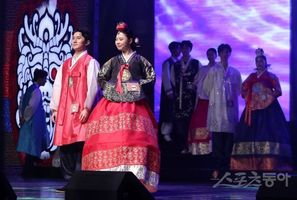 9일 서울 광진구 유니버셜아트센터에서 ‘2019 세종대왕 소헌왕후 선발대회’가 열렸다. 세종대왕과 소헌왕후 참가자들이 단체 퍼포먼스를 선보이고 있다. 김진환 기자 kwangshin00@donga.com