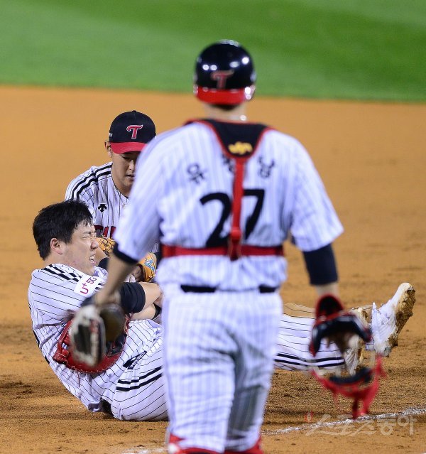 10일 서울 고척스카이돔에서 ‘2019 신한은행 MY CAR KBO 포스트시즌’ 준플레이오프 4차전 키움 히어로즈와 LG 트윈스의 경기가 열렸다. LG 1루수 김현수가 2회초 키움 송성문과 충돌 후 고통스러워 하고 있다. 잠실 | 김진환 기자 kwangshin00@donga.com