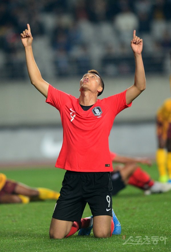 10일 경기도 화성종합경기타운 주경기장에서 열린 국제축구연맹(FIFA) 2022 카타르월드컵 아시아 지역 2차 예선 H조 조별리그 2차전 한국과 스리랑카 경기에서 한국 김신욱이 팀의 네 번째 골을 성공시킨 후 세리머니를 하고 있다. 화성 | 김종원 기자 won@donga.com