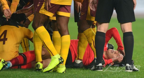 10일 경기도 화성종합경기타운 주경기장에서 열린 국제축구연맹(FIFA) 2022 카타르월드컵 아시아 지역 2차 예선 H조 조별리그 2차전 한국과 스리랑카 경기에서 한국 손흥민이 공중볼을 다투다 부상을 당해 그라운드에 누워 있다. 화성 | 김종원 기자 won@donga.com