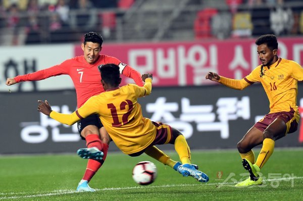 10일 경기도 화성종합경기타운 주경기장에서 한국과 스리랑카의 카타르월드컵 아시아 예선 경기가 열렸다. 한국 손흥민이 스리랑카 수비수를 제치며 슛을 날리고 있다. 화성 | 김민성 기자 marineboy@donga.com
