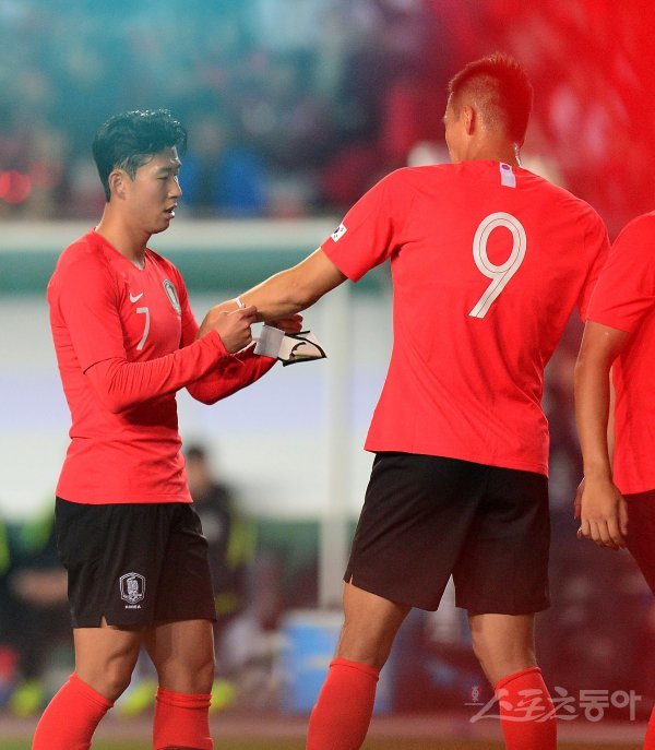 10일 경기도 화성종합경기타운 주경기장에서 열린 국제축구연맹(FIFA) 2022 카타르월드컵 아시아 지역 2차 예선 H조 조별리그 2차전 한국과 스리랑카 경기에서 후반전 한국 손흥민이 교체되며 김신욱에게 주장 완장을 차주고 있다. 화성 | 김종원 기자 won@donga.com