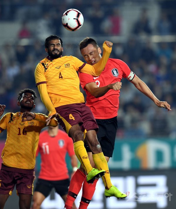 10일 경기도 화성종합경기타운 주경기장에서 한국과 스리랑카의 카타르월드컵 아시아 예선 경기가 열렸다. 한국 김신욱이 스리랑카 수비수와 공중볼을 다투고 있다. 화성 | 김민성 기자 marineboy@donga.com