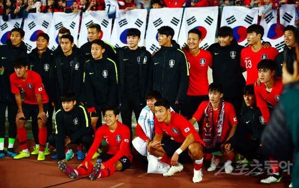 10일 경기도 화성종합경기타운 주경기장에서 한국과 스리랑카의 카타르월드컵 아시아 예선 경기가 열렸다. 한국이 스리랑카에 8-0으로 승리한 뒤 팬들 앞에서 기념촬영을 하고 있다. 화성 | 김민성 기자 marineboy@donga.com
