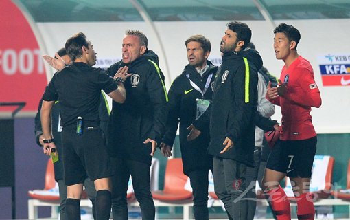 한국 대표팀 주장 손흥민은 이날 팀이 6-0으로 앞선 후반 15분경 교체 아웃되는 과정에서 심판에게 경고를 받았다. 이에 벤투 감독은 주심에게 강력하게 항의하며 큰 제스처를 취하는 모습이 포착됐다.