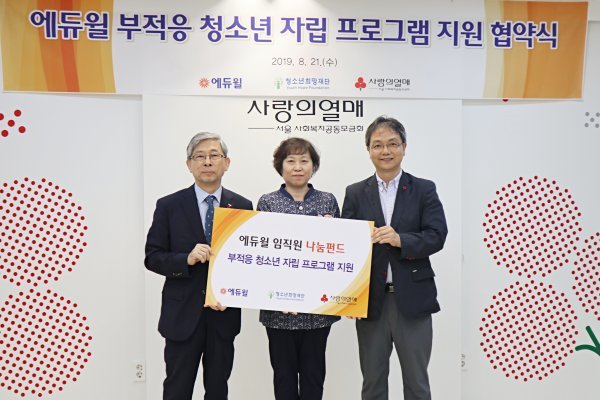 에듀윌은 매달 매칭그랜트 형식으로 회사와 임직원이 함께 일정 금액을 적립하는 ‘임직원 나눔펀드’를 조성한다. 지난 8월에는 서울 사회복지공동모금회와 청소년희망재단과 함께 ‘부적응 비행 청소년 자립 프로그램 지원 사업’ 업무 협약을 체결했다.