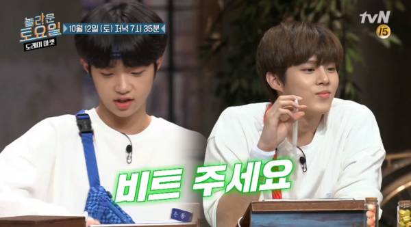 본격적인 받아쓰기가 시작되고 김우석은 예상과 달리 깜짝 실력을 발휘해 이목을 모았다. 적극적으로 의견을 내놓으며 원샷 자리를 노리는가 하면, 자신의 활약상을 재차 강조하는 엉뚱함마저 선보여 웃음을 안겼다. 자신만만하던 손동표는 의외의 부진 속 고집왕의 면모까지 자랑하며 멤버들로부터 “어린 김동현”, “미성년 라비”라는 다양한 애칭을 얻어 재미를 더했다.
