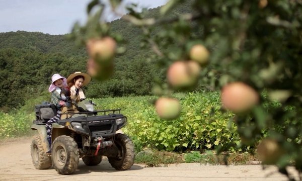 방송을 앞두고 제작진이 공개한 사진에는 사과 농장에서 사륜 오토바이를 몰며 스피드를 즐기고 있는 유인나의 모습이 포착돼 궁금증을 자아낸다. 밀짚 모자와 팔토시로 완벽 작업 복장을 갖춘 유인나는 뒤에 장도연까지 태운 채 “워어~”하는 환호성을 지르며 가파른 언덕길을 질주했다.