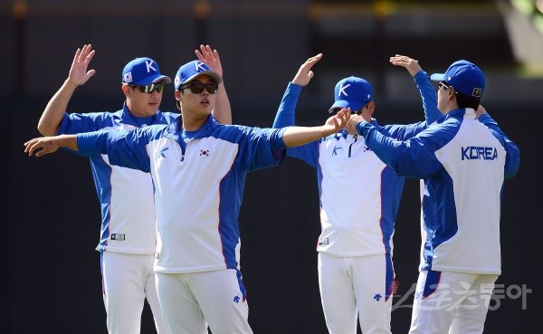 2019 WBSC 프리미어12 출전하는 야구 국가대표팀이 13일 수원 KT위즈파크에서 훈련을 가졌다. 대표팀 선수들이 스트레칭으로 몸을 풀고 있다.