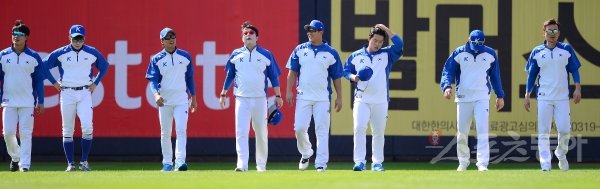 2019 WBSC 프리미어12 출전하는 야구 국가대표팀이 13일 수원 KT위즈파크에서 훈련을 가졌다. 대표팀 선수들이 스트레칭을 마치고 더그아웃으로 향하고 있다.