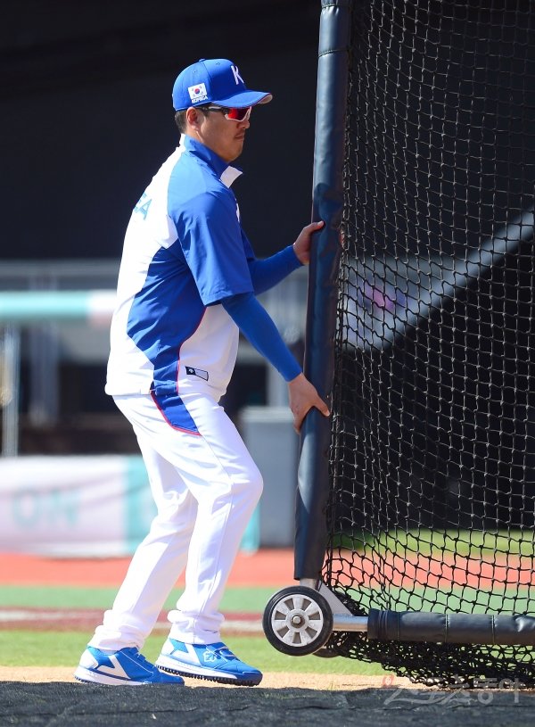 2019 WBSC 프리미어12 출전하는 야구 국가대표팀이 13일 수원 KT위즈파크에서 훈련을 가졌다. 이진영 코치가 훈련 도구를 옮기고 있다.
