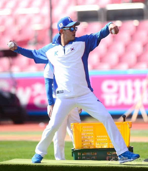 2019 WBSC 프리미어12 출전하는 야구 국가대표팀이 13일 수원 KT위즈파크에서 훈련을 가졌다. 최원호 코치가 베팅볼을 던져주고 있다.