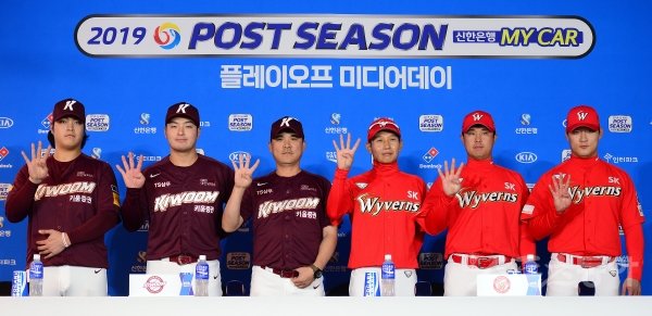 13일 인천 SK행복드림구장에서 ‘2019 신한은행 MY CAR KBO리그’ SK 와이번스와 키움 히어로즈의 플레이오프 미디어데이가 열렸다. 키움 조상우, 박병호, 장정석 감독과 SK 염경엽 감독, 최정, 하재훈이 카메라를 향해 포즈를 취하고 있다.
