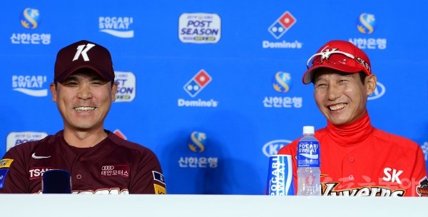 13일 인천 SK행복드림구장에서 ‘2019 신한은행 MY CAR KBO리그’ SK 와이번스와 키움 히어로즈의 플레이오프 미디어데이가 열렸다. 키움 장정석 감독과 SK 염경엽 감독이 인터뷰 도중 미소를 짓고 있다.