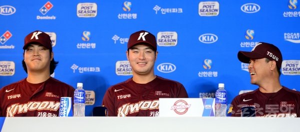 13일 인천 SK행복드림구장에서 ‘2019 신한은행 MY CAR KBO리그’ SK 와이번스와 키움 히어로즈의 플레이오프 미디어데이가 열렸다. 키움 박병호의 홈런 미소에 장정석 감독이 흐믓해 하고 있다.