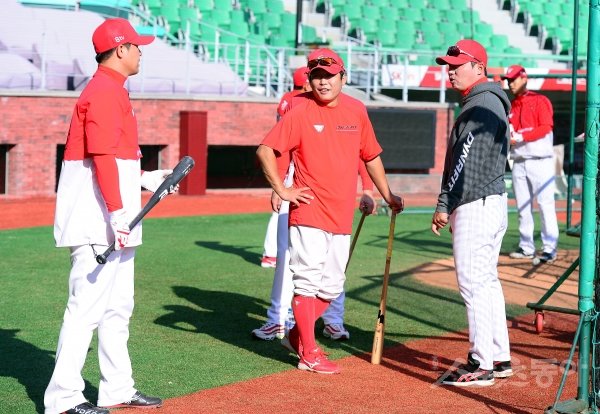 13일 인천 SK행복드림구장에서 ‘2019 신한은행 MY CAR KBO리그’ SK 와이번스와 키움 히어로즈의 플레이오프 1차전을 앞두고 SK가 훈련을 가졌다. SK 최정이 훈련을 마치고 코치들과 이야기를 나누고 있다.