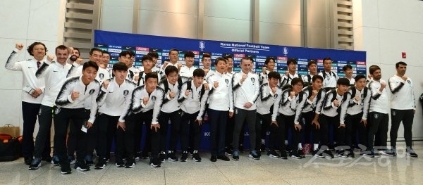 15일 평양 김일성경기장에서 북한과 2022년 카타르월드컵 아시아 2차예선 원정 3차전을 갖는 축구 국가대표팀이 13일 인천국제공항을 통해 출국했다. 출국 전 축구대표팀이 기념촬영을 하고 있다.
