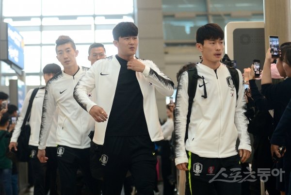 15일 평양 김일성경기장에서 북한과 2022년 카타르월드컵 아시아 2차예선 원정 3차전을 갖는 축구 국가대표팀이 13일 인천국제공항을 통해 출국했다. 조현우, 김민재, 김문환이 출국장으로 들어오고 있다.