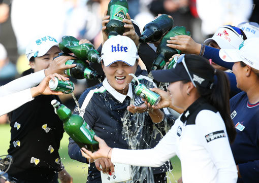 시원한 ‘술 세례’다. 세계랭킹 1위 고진영(가운데)이 13일 경기도 여주 블루헤런 골프클럽에서 끝난 KLPGA투어 하이트진로 챔피언십에서 우승한 뒤 동료들의 맥주 세례를 받으며 즐거워하고 있다. 그는 세리머니로 ‘소맥’을 마신 뒤 “소주량이 조금 아쉬웠다”고 색다른 소감도 곁들였다. 사진제공|KLPGA