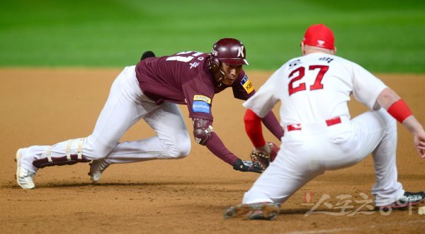 1회초 1사 1루 키움 이정후가 중전 안타를 치고 2루로 가다 귀루했으나 태그 아웃되고 있다.