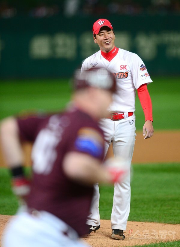 선발 투수로 등판한 SK 김광현이 4회초 2사 키움 샌즈에게 안타를 허용한 후 웃고 있다.