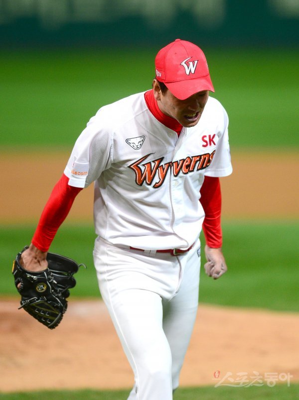 선발 투수로 등판한 SK 김광현이 4회초 2안타를 허용한 후 더그아웃으로 들어가며 소리를 치고 있다.