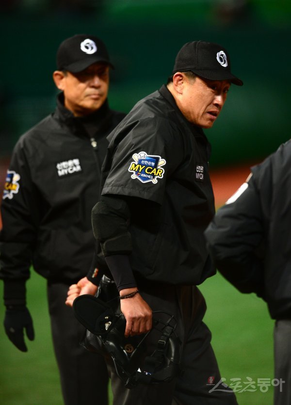 2회말 박기택 주심이 공에 맞아 고통스러워 하고 있다.
