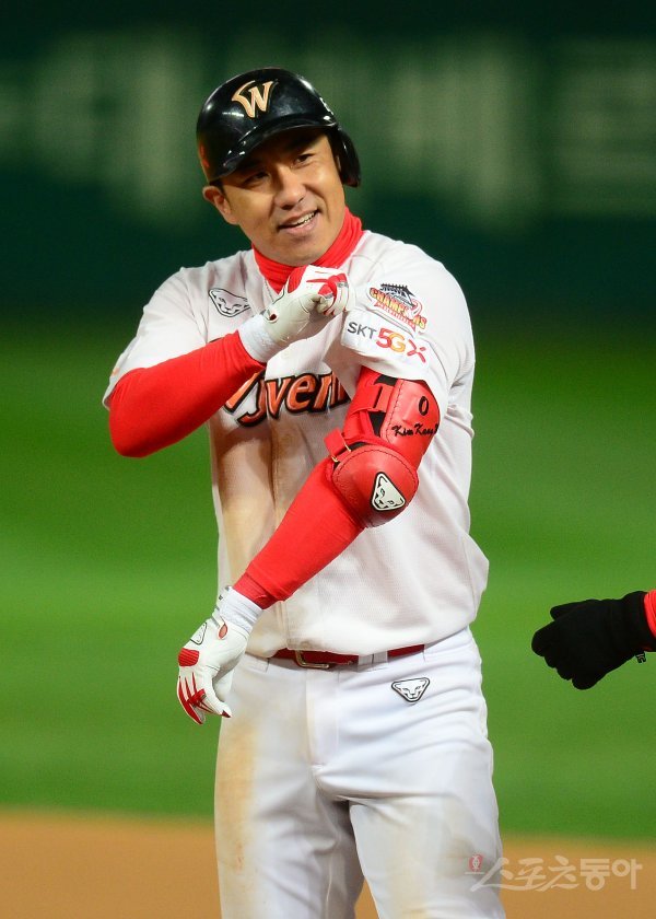 6회말 무사 SK 김강민이 좌전 안타를 치고 1루에서 기뻐하고 있다.