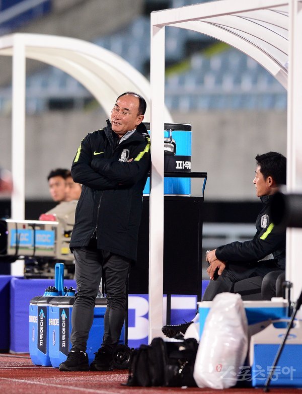 대한민국 김학범 감독이 후반 경기를 지켜보고 있다.