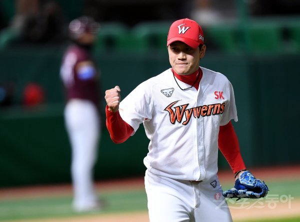 7회초 2사 1, 3루에서 키움 이정후를 아웃시킨 SK 서진용이 주먹을 쥐며 환호하고 있다.