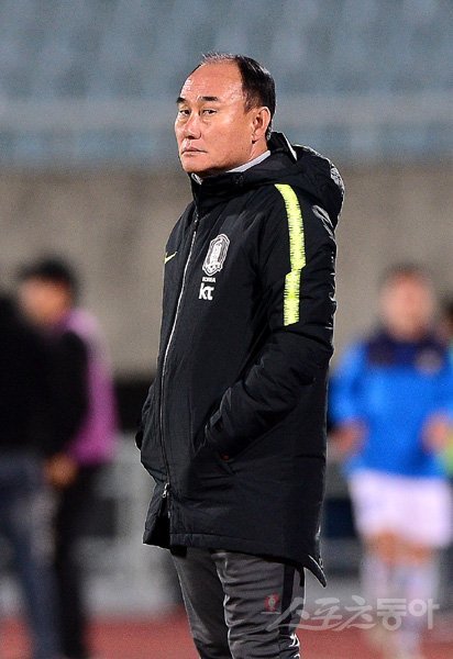 14일 충청남도 천안시 천안종합운동장에서 대한민국 U-22 대표팀과 우즈베키스탄의 친선경기가 열렸다. 대한민국 김학범 감독이 굳은 표정으로 경기를 지켜보고 있다. 천안|김진환 기자 kwangshin00@donga.com