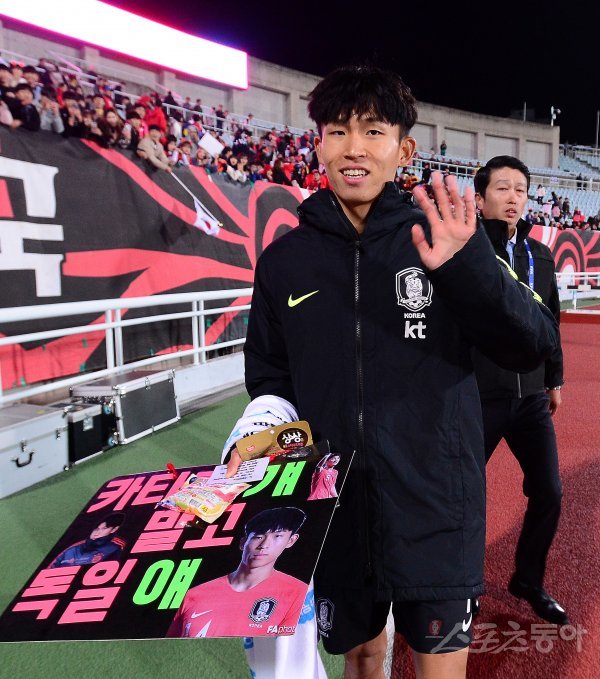 경기 후 대한민국 정우영이 카메라를 향해 손을 흔들고 있다.