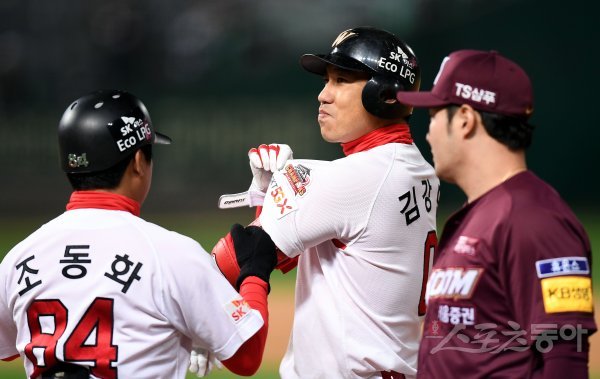 14일 인천 SK행복드림구장에서 ‘2019 신한은행 MY CAR KBO리그’ SK 와이번스와 키움 히어로즈의 플레이오프 1차전 경기가 열렸다. 10회말 1사에서 SK 김강민이 안타를 날린 뒤 챔피언 마크를 보이며 환호하고 있다. 인천 | 김민성 기자 marineboy@donga.com