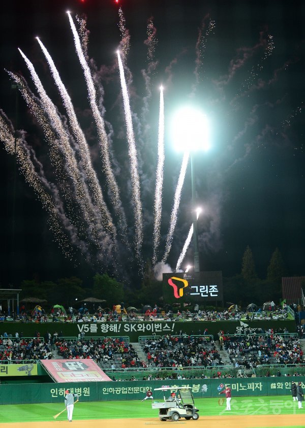 클리닝타임 때 외야에 축포가 터지고 있다.